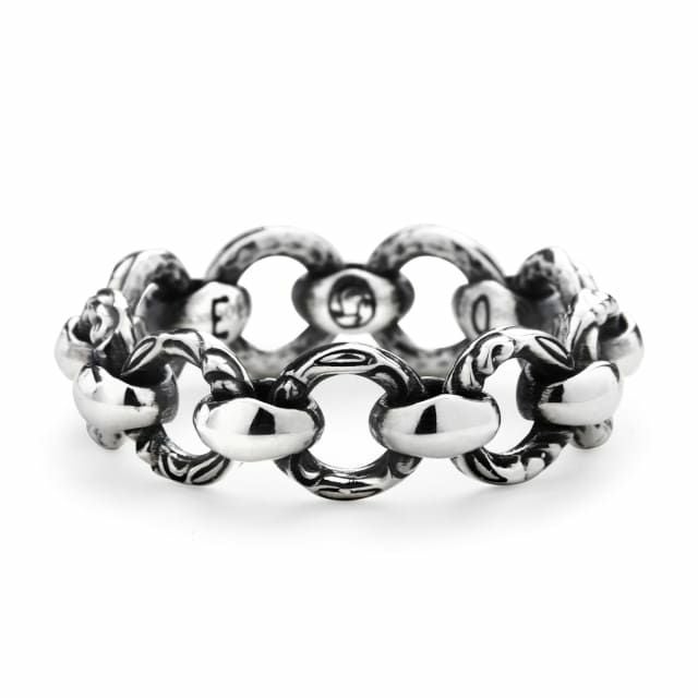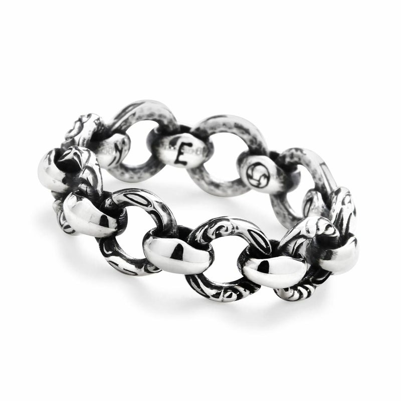 鏡面仕上げのシルクパーツと、繊細な彫刻のクレーンリングパーツが交互にデザインされたリング。ブランドの魅力を存分に味わう事が出来る。
