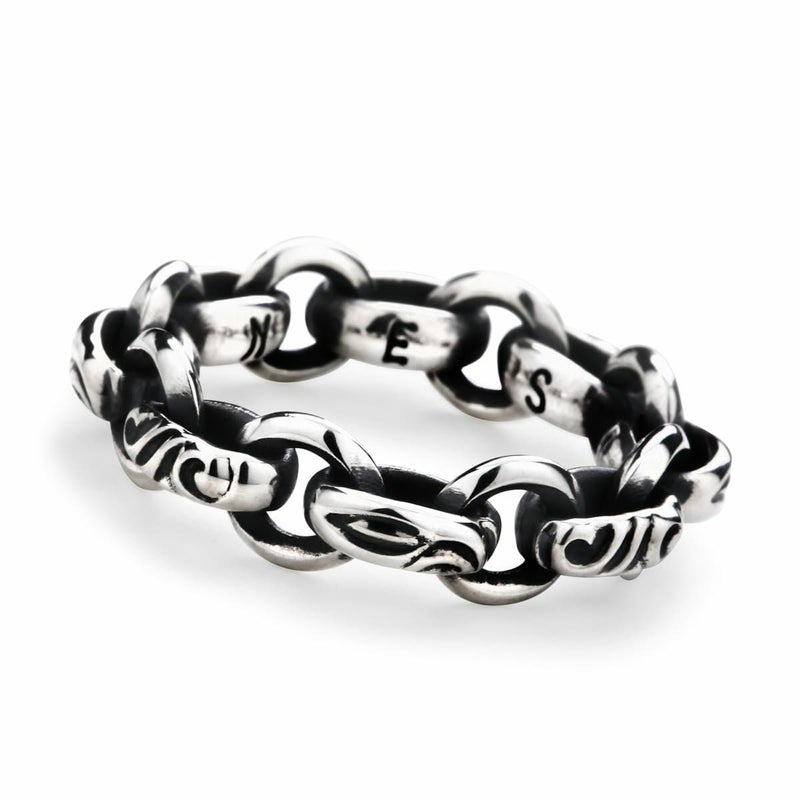 鶚デザインの彫りが入ったパーツに、プレーンサークルを連結させたリング。小振りながらもブランドならではの鏡面と彫りを堪能出来る作品。