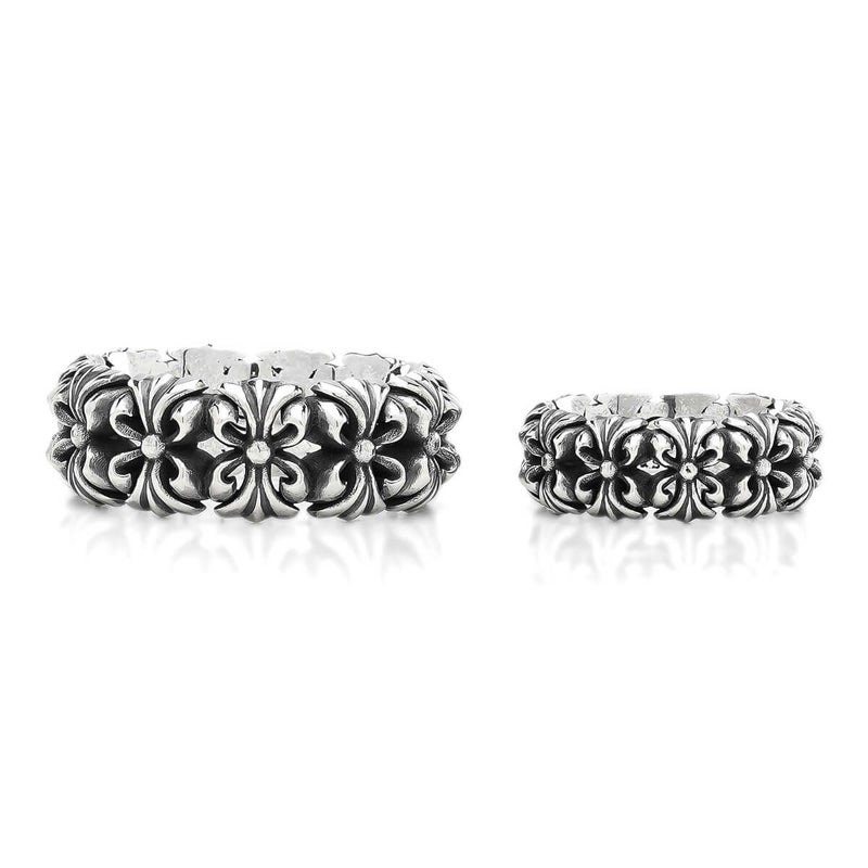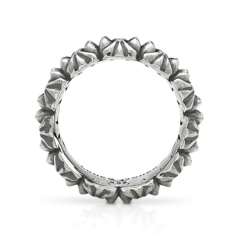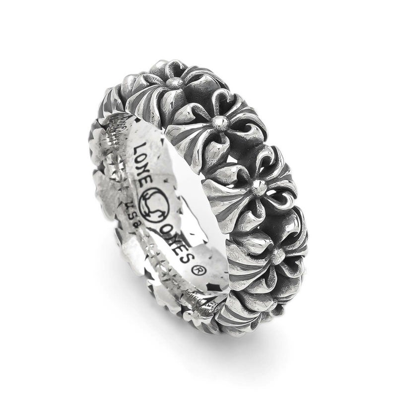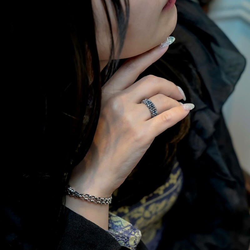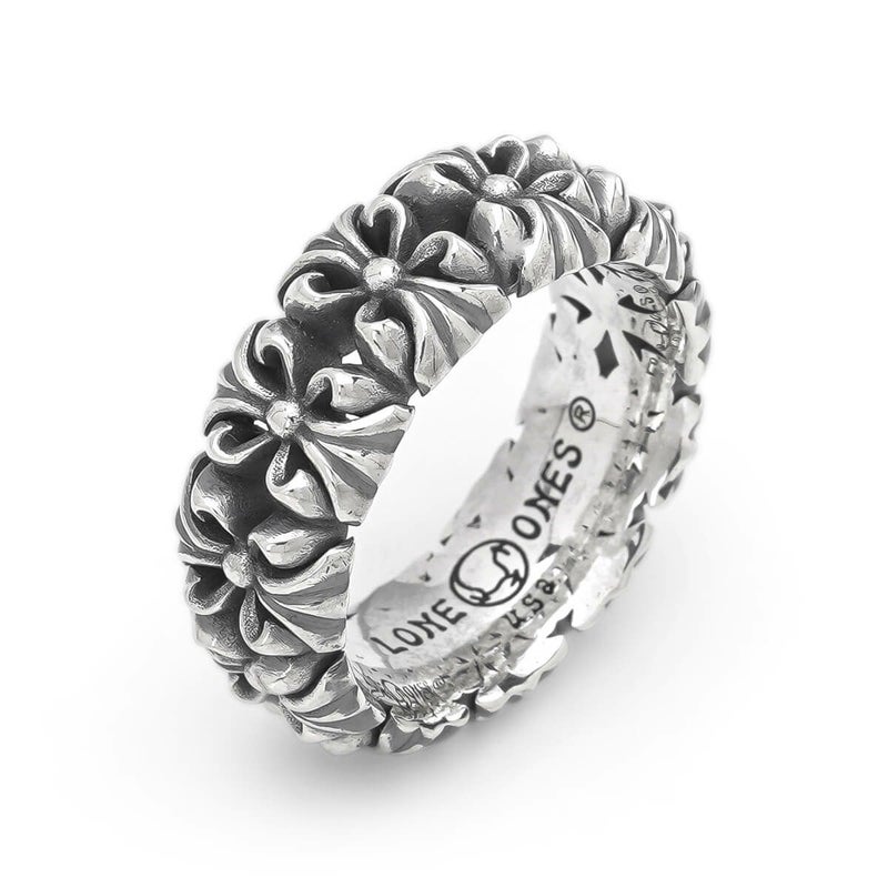 業界を賑わせた話題のクロムベルペンダント、その縁部デザインを見事にリングへと落とし込んだ作品。ベルと同様に、これまでのロンワンズとは一線を画すデザイン性が際立ち、存在感を放つ無骨な立体モチーフが連なり、コーディネート全体をクールに引き締めます。クロムベルペンダントとの相性も抜群で、セットでの着用がおすすめです。