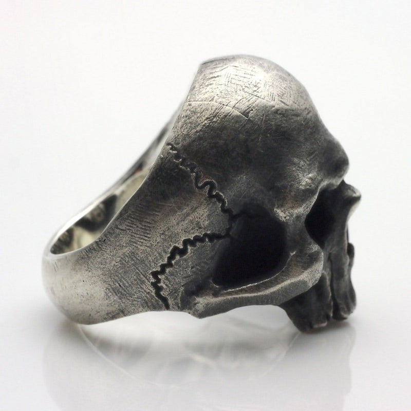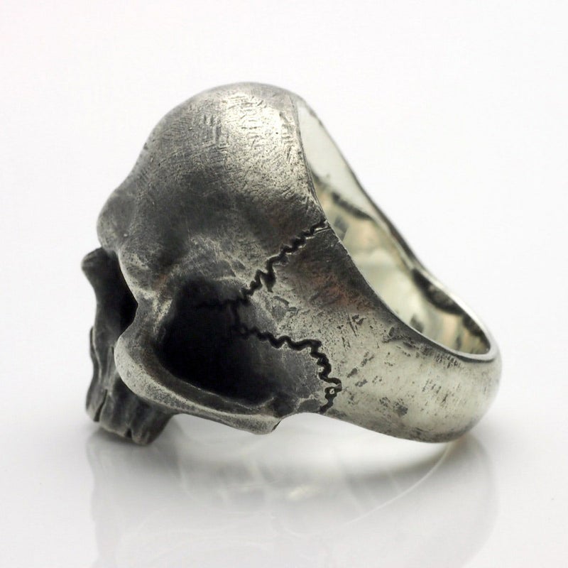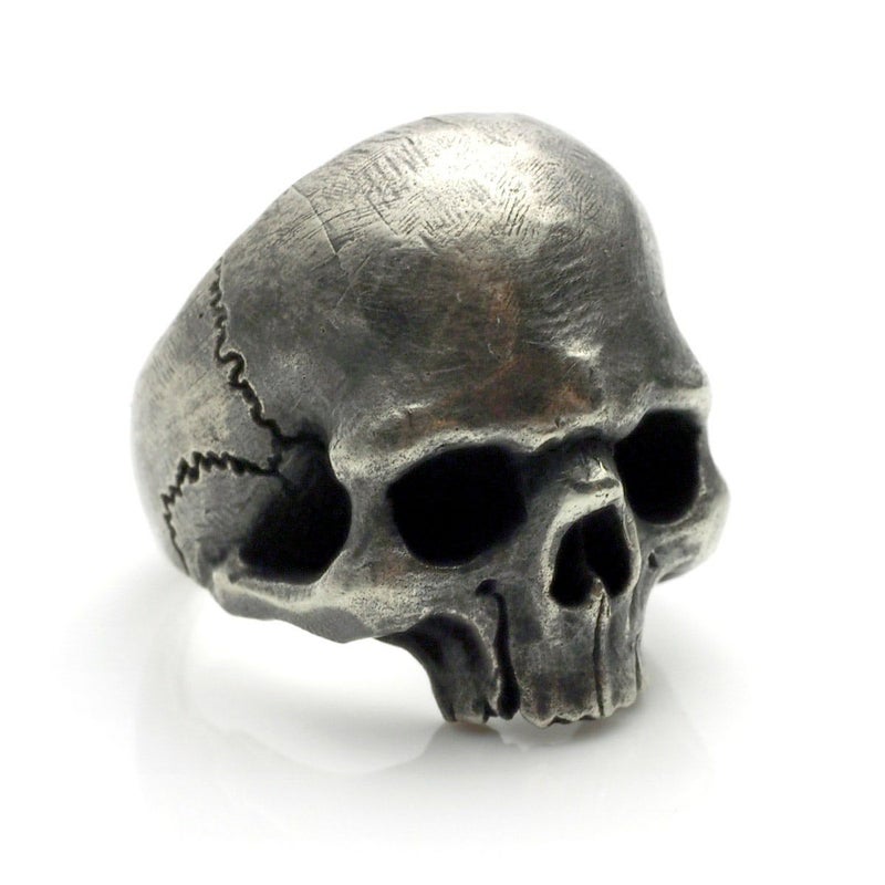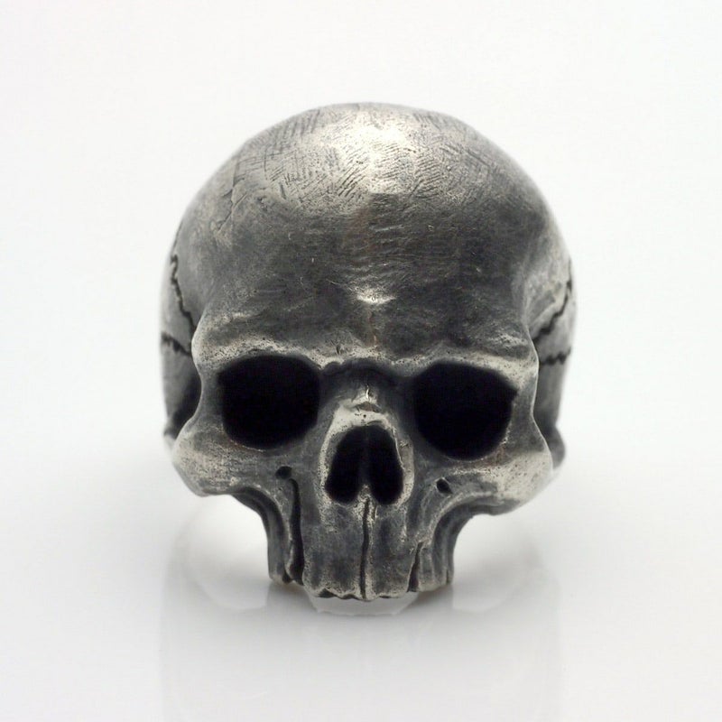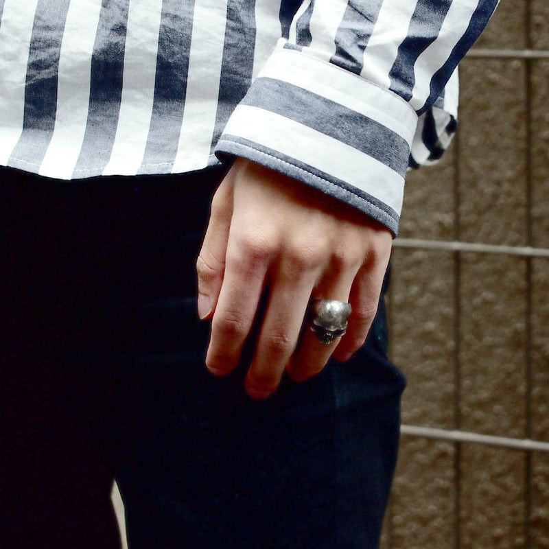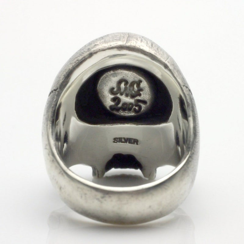 見透かされる様な据わった表情を持つスカルリング。小振りなボリューム感でピンキーリングやレディースにも良い。ラフポリッシュのSTANDARD FINISHと、ザラついた質感のMAT FINISHの2パターンからご希望の仕上げをご選択下さいませ。※写真はMAT FINISHです。
