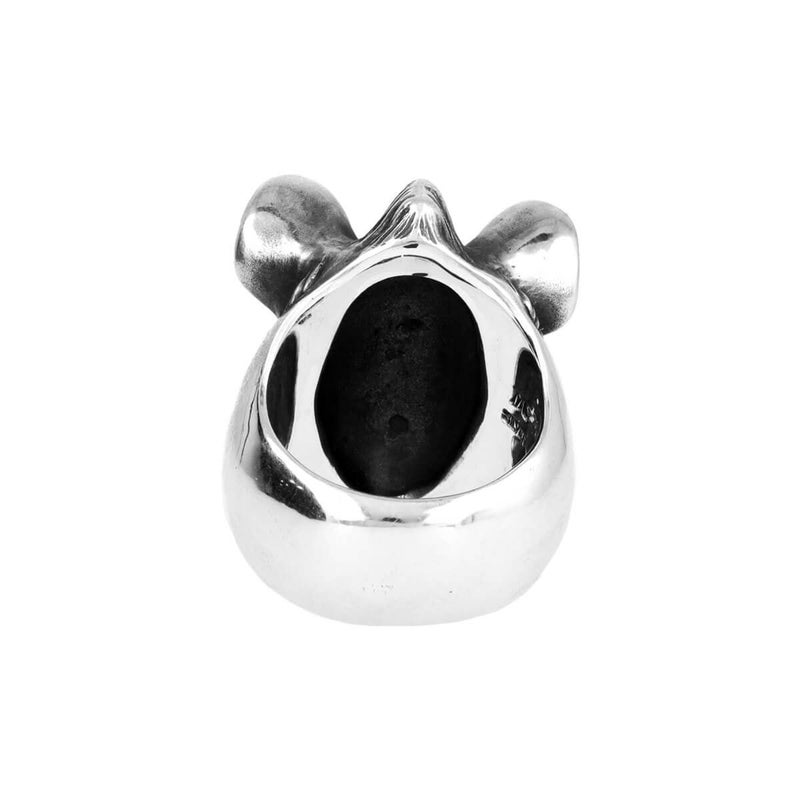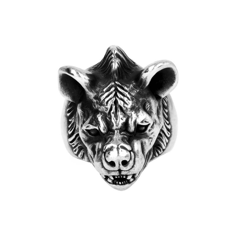 獲物に狙いをさだめ唸り声を上げるリアルな表情を再現した、ハイエナの姿を立体感あふれるデザインとして再現したリング。