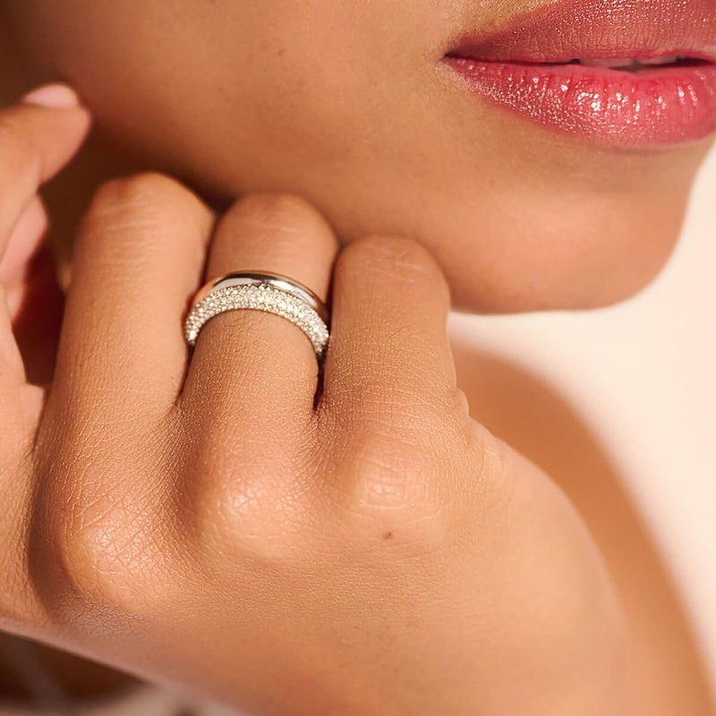 オリビア・バートンのシグネチャーが施されたステンレススチール製のバンドと、クリスタルをあしらったリングがセットになっています。