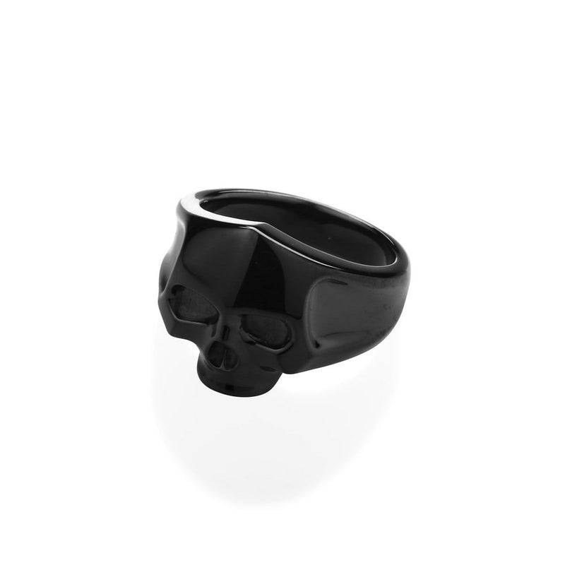 独自のエッジ感と巧みな面構成によって表現されたスカルリング。素材の上にブラックチタンコーティングを使用することによりソリッドな印象をプラスした他にはない造形美を持つ。