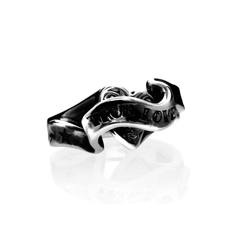 トライバル柄を彫ったハートに立体的にリボンが絡むRING。 リング本体とリボンを別パーツで構成する事で、より立体的で奥行きのあるデザインに。 リボンにはメッセージ「TRUE LOVE」が刻まれている。