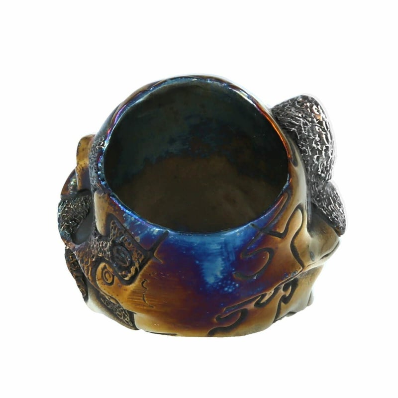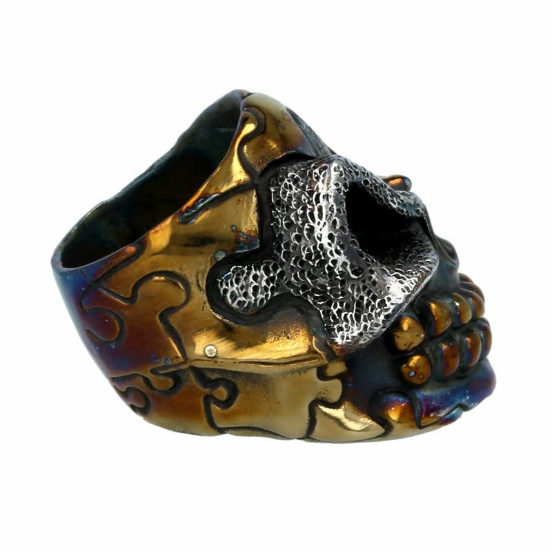 ブランド設立からデザイナーの頭の中にモチーフイメージがあったパズル、20年の時を経て完成された作品です!コバルトは素材が非常に硬度なため、異素材の組み合わせや上からハンドテクスチャーは出来きません。表面をヒートする事で焼き色をつけブルーやゴールドに、研磨する事で地のシルバーカラーを出しています。ハンドテクスチャーはWAXの段階で手作業で一つ一つ施している特別な作品です。