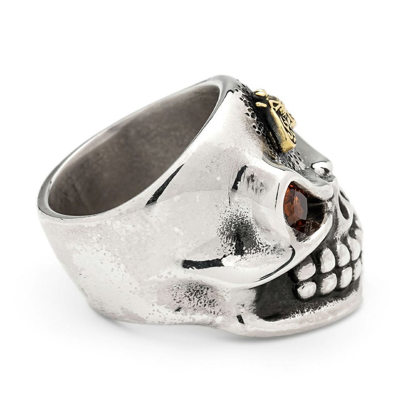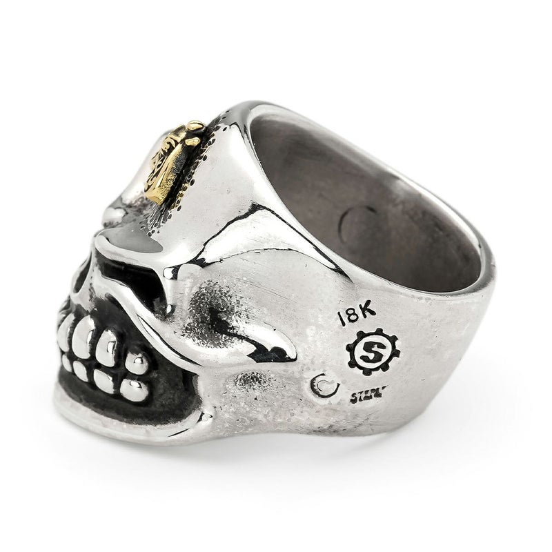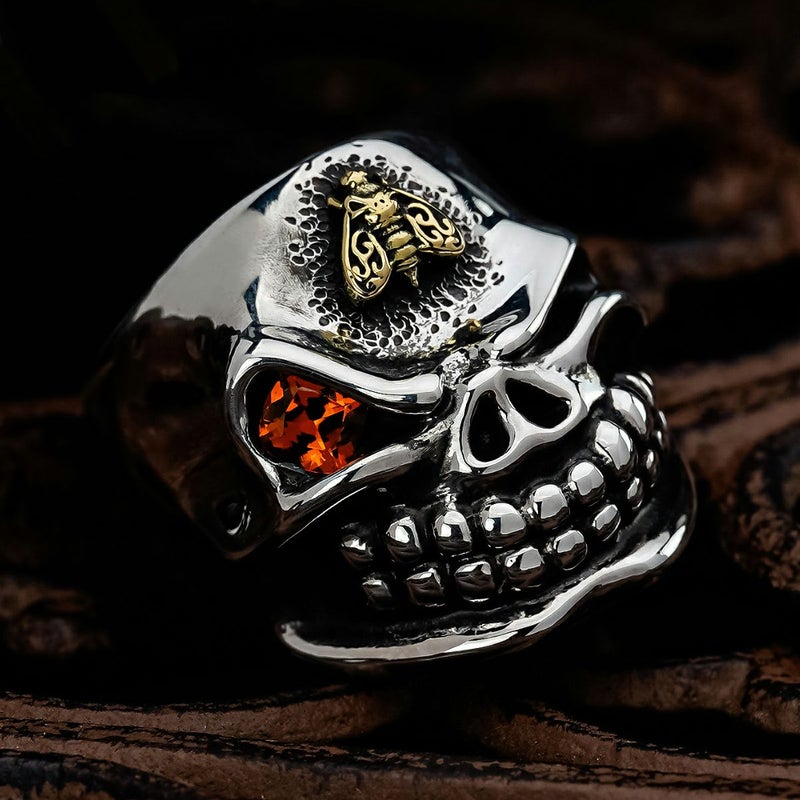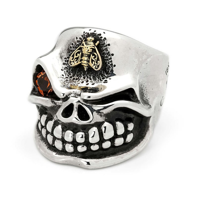 更にオリジナルで作成された18金ゴールドのスカルを乗せた蜂のパーツと、ジェムジュエラーによる特殊スクエアカットのスぺサルタイトガーネットがセッティングされています。