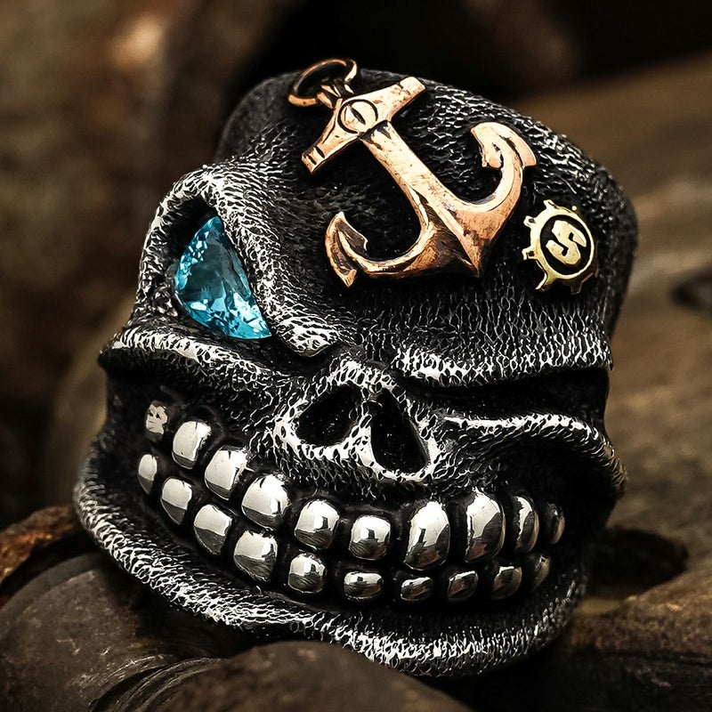こちらはコパー素材のアンティークのアンカーパーツとブラス素材のSギアロゴを取り付け、そしてジェムジュエラーが原石から削り出したアパタイトがセッティングされた究極の一品です。
