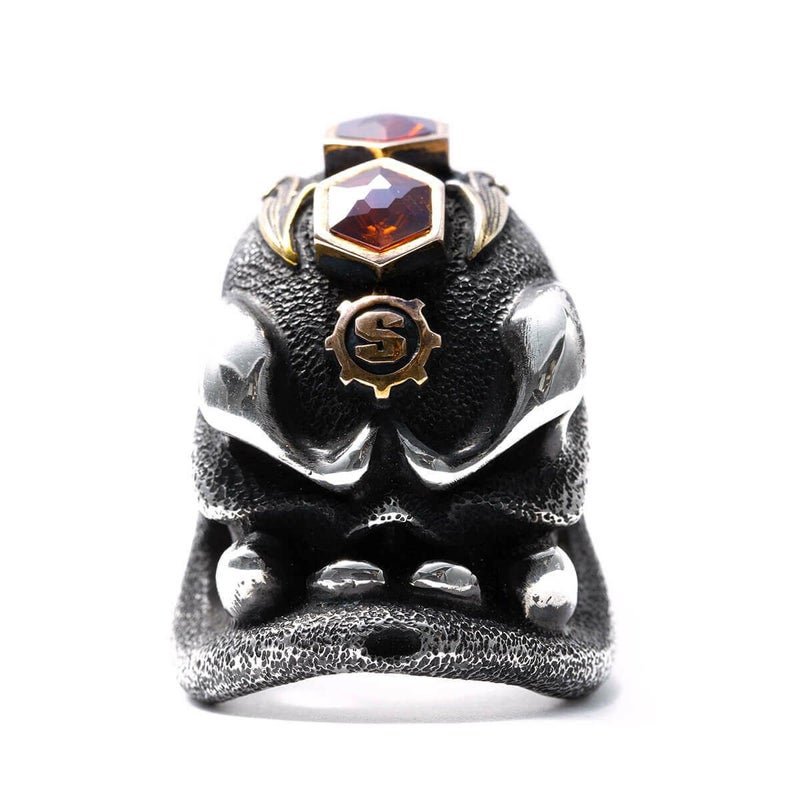 ワンオフシリーズの新しいMFリング。原型はプレーンでオデコには何もない状態で、そこにコパーとブラスのパーツをアタッチし、さらに特殊カットを施したスぺサルタイトガーネットを2石搭載した贅沢な一品。全体のハンドテクスチャーは鋳造後に手作業で施している究極の1点物です。2022年6月インストアイベント発売