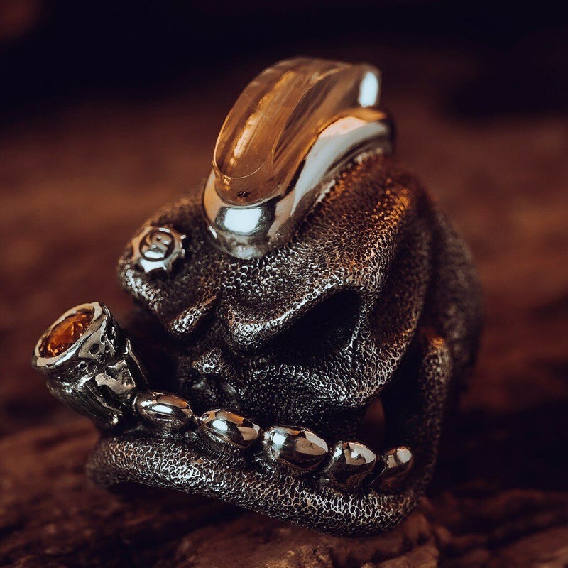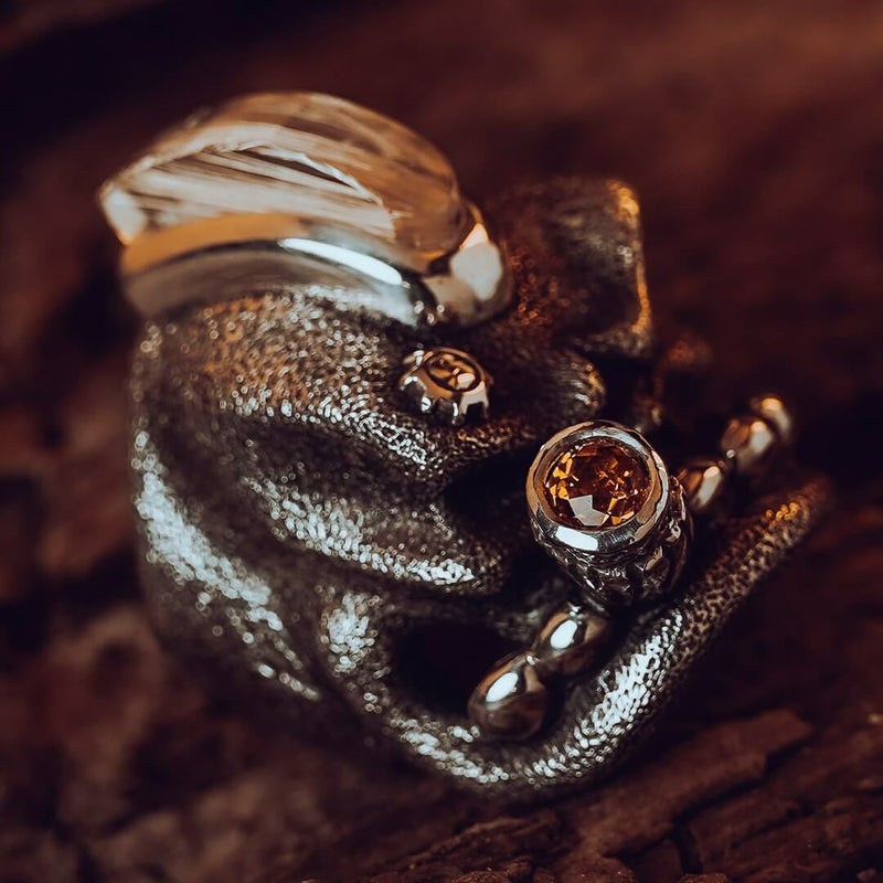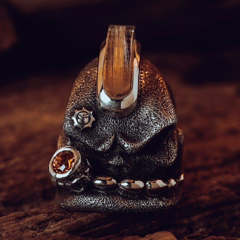ワンオフシリーズのSOBリング。 原型はプレーンでオデコには何もない状態で、シルバー素材のモヒカンにビッグシガーとSギアロゴを付け、更にジェムジュエラーのZAVAが原石から削り出して特殊カットされたブラジル産のルチルクォーツをモヒカン形に施し、タンザニア産のオレンジマレーヤガーネットをシガーの先端にセッティングした贅沢な一品。