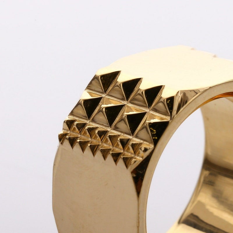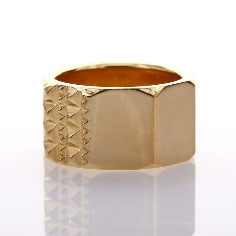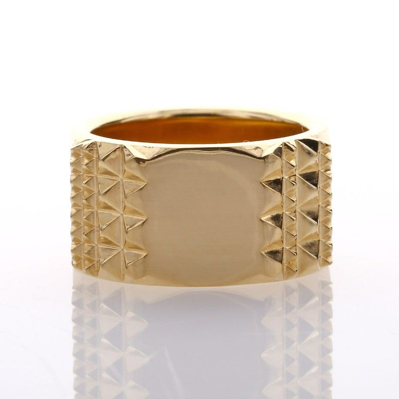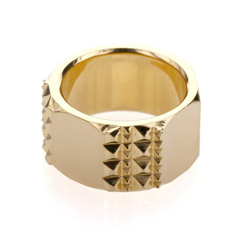 大小規則的に並んだピラミッドスタッズと、プレーンな鏡面がコントラスト生むリング。
