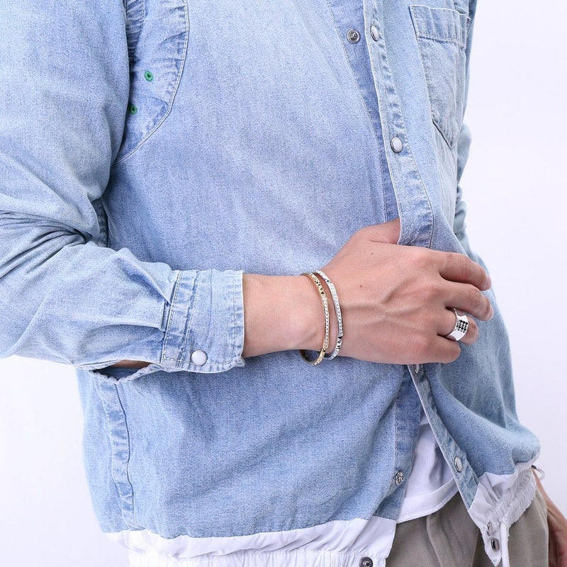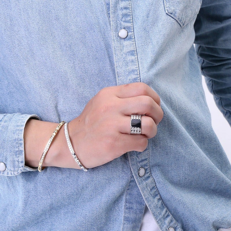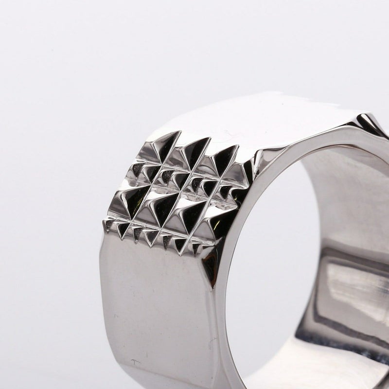 大小規則的に並んだピラミッドスタッズと、プレーンな鏡面がコントラスト生むリング。
