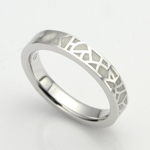 ガウディの建造物に多用されるモザイク柄をリングに落とし込みました。モザイク部分に用いているエポキシ樹脂は特別な調合をする事で独特な広がりを持つ色に仕上げています。