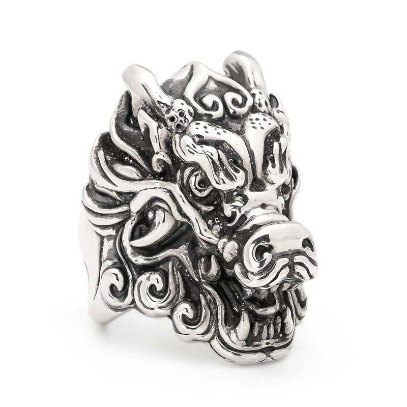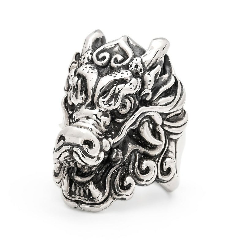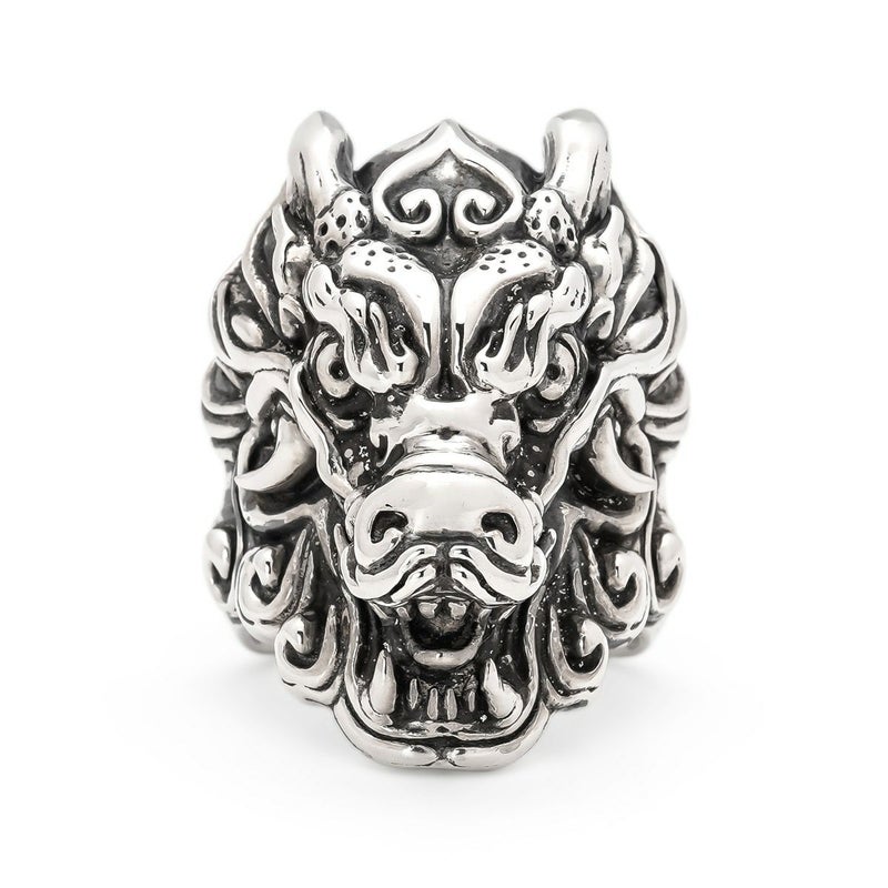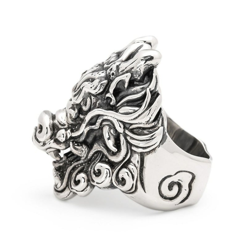 神社仏閣にある彫刻の龍のように、正面から立体的に飛び出し来る龍を演出したドラゴンリング。