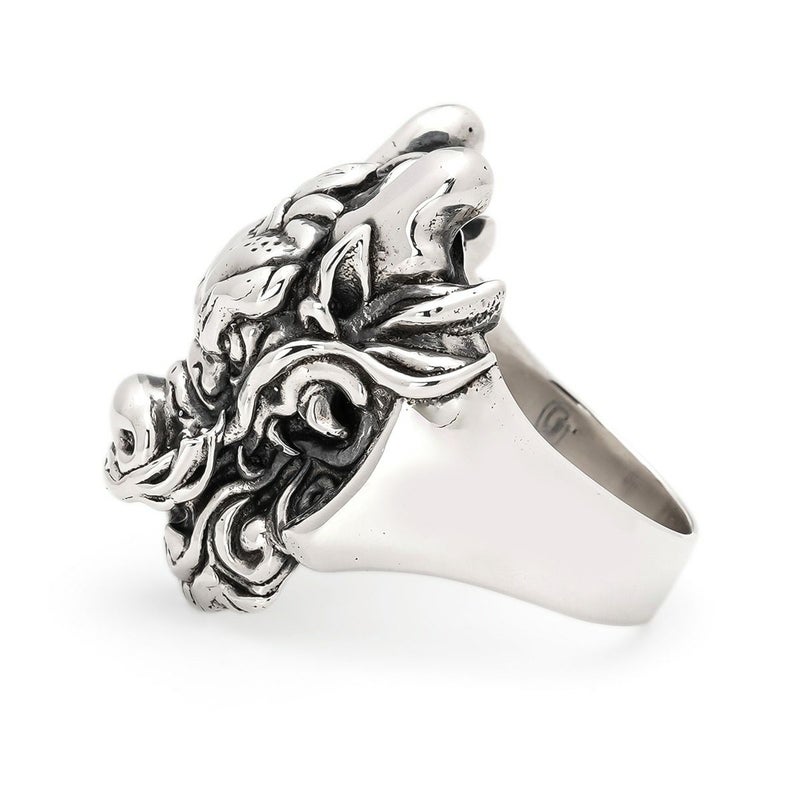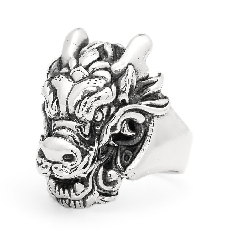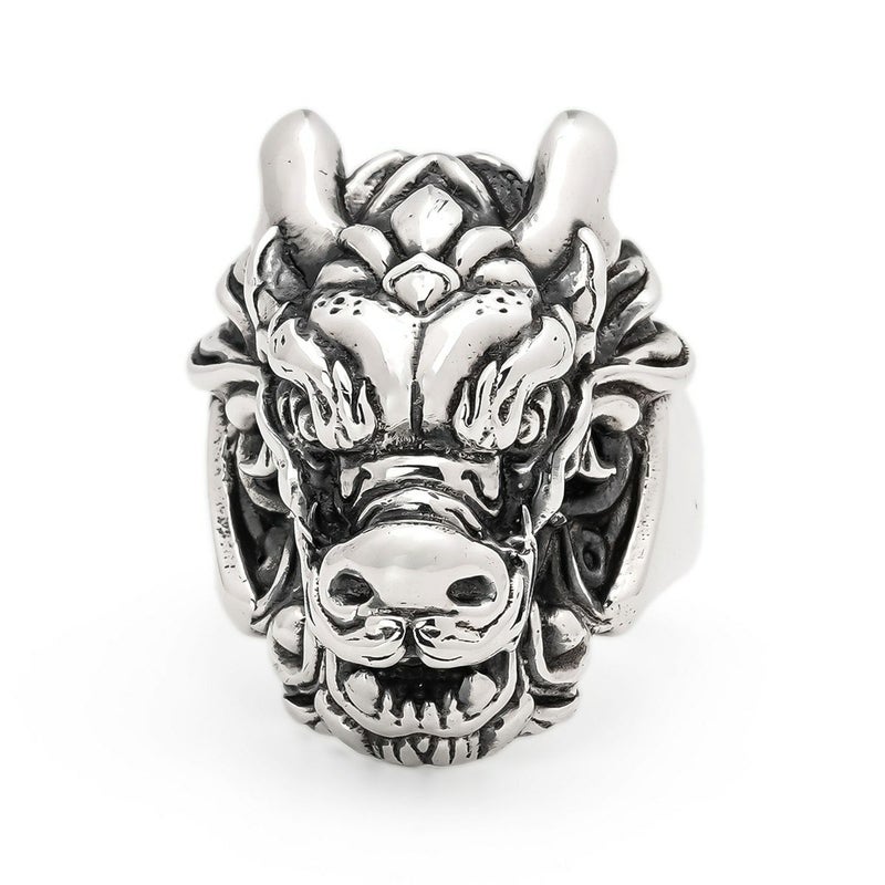 神社仏閣にある彫刻の龍のように、正面から立体的に飛び出し来る龍を演出したドラゴンリング。