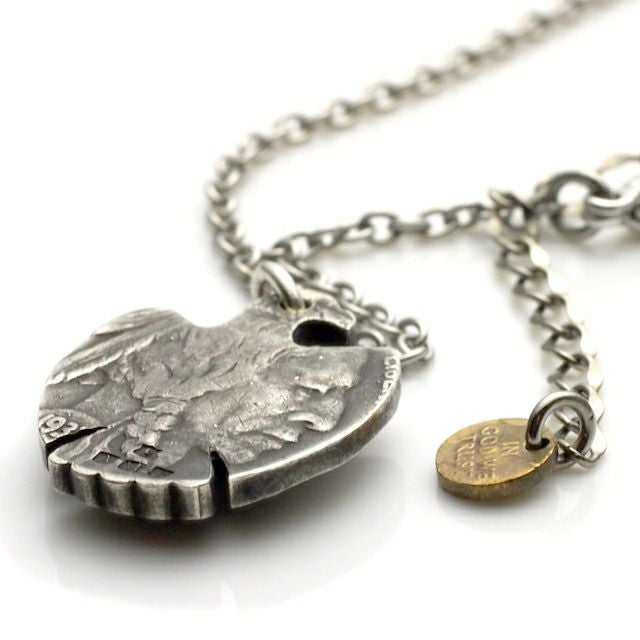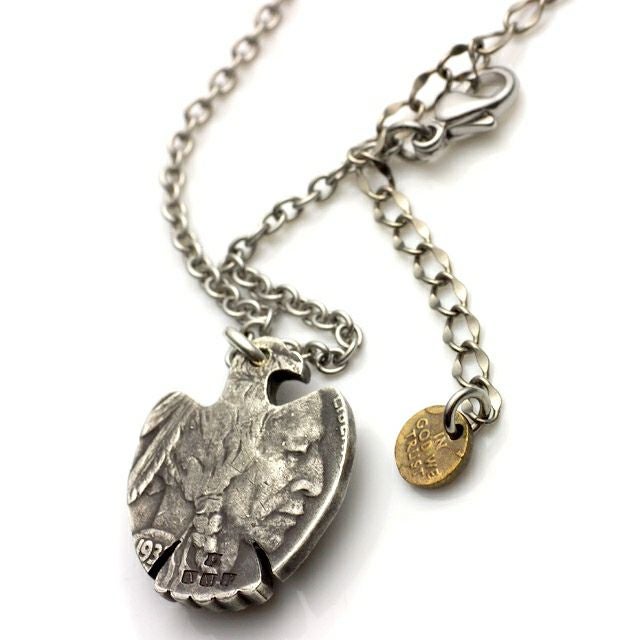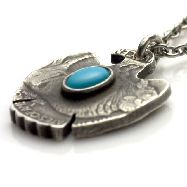 アメリカ・インディアン部族に伝わる精霊「サンダーバード」型にカットしたバッファローコインにターコイズをセットし、インディアンジュエリーらしい仕上がりに。