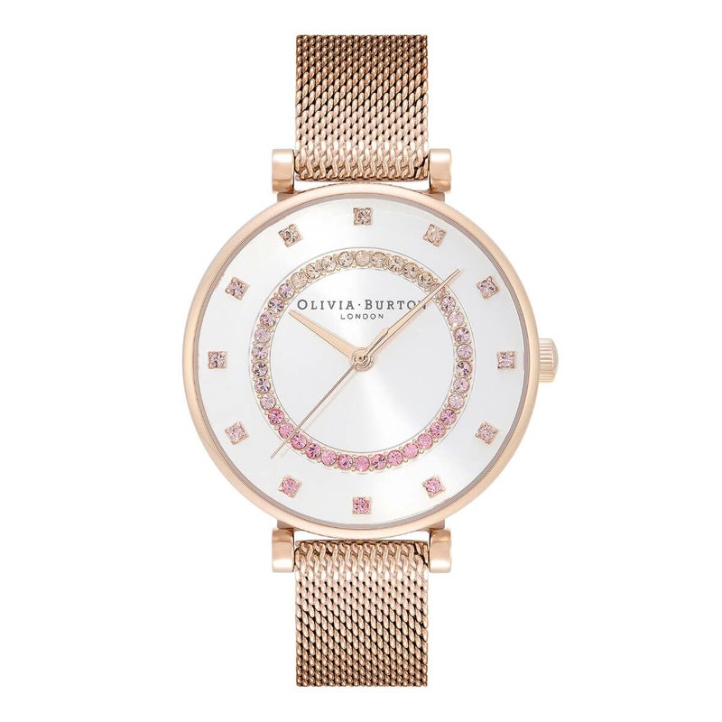 ロンドンのシックな街並みにインスパイアされたベルグレイブウォッチで、アーバンなスタイルを手に入れよう。ロンドンのシックな街、ベルグラビアにインスパイアされたウォッチです。サンレイダイヤルに同系色のオンブレイクリスタルをあしらい、トラッキングとマーカーを配置したクールで洗練されたデザインです。カーネーションゴールドのメッシュストラップが添えられ、ラグジュアリーな雰囲気を醸し出しています。