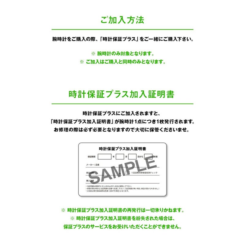 ・時計保証プラス単体でのご注文はお受けしておりません。時計保証プラスのみのご注文は、購入手続き完了後であっても受注処理時に自動的にキャンセルさせて頂きます。予めご了承ください。