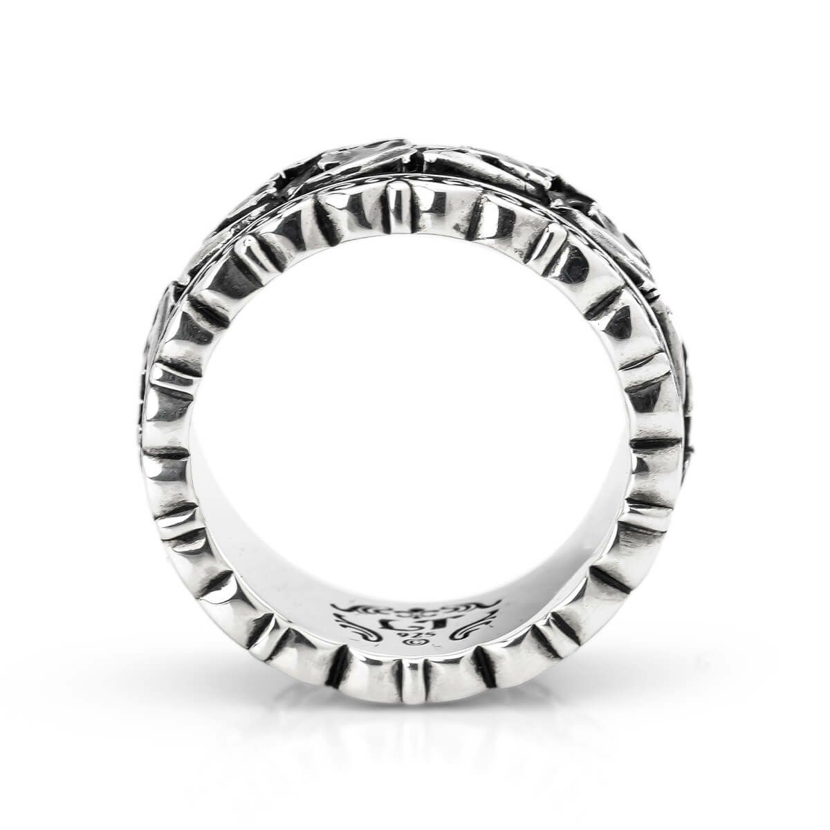 リングの上下に繊細な彫刻を施した、中央が回転するリボルビング技法で作られたリング。ベルト箇所には古くより伝わるフローラル柄を表現したデザインを組み合わせている。