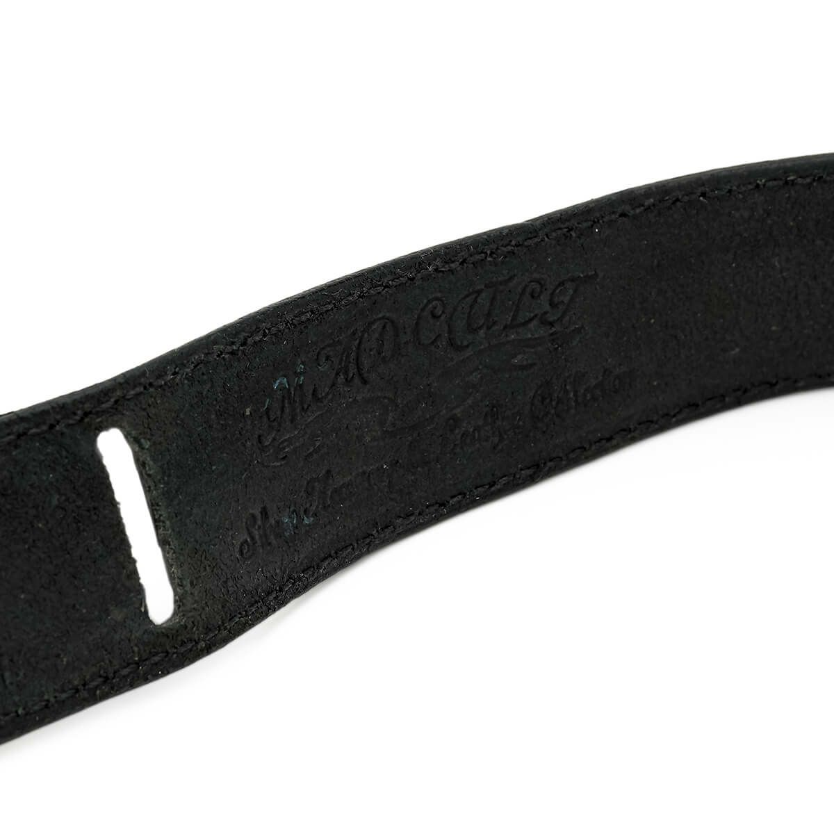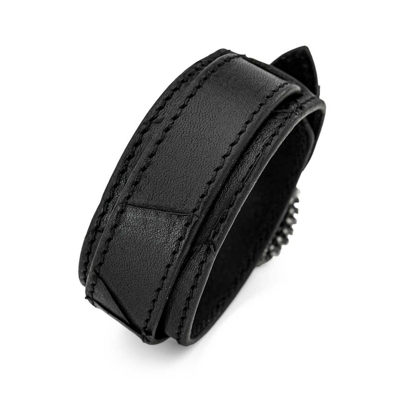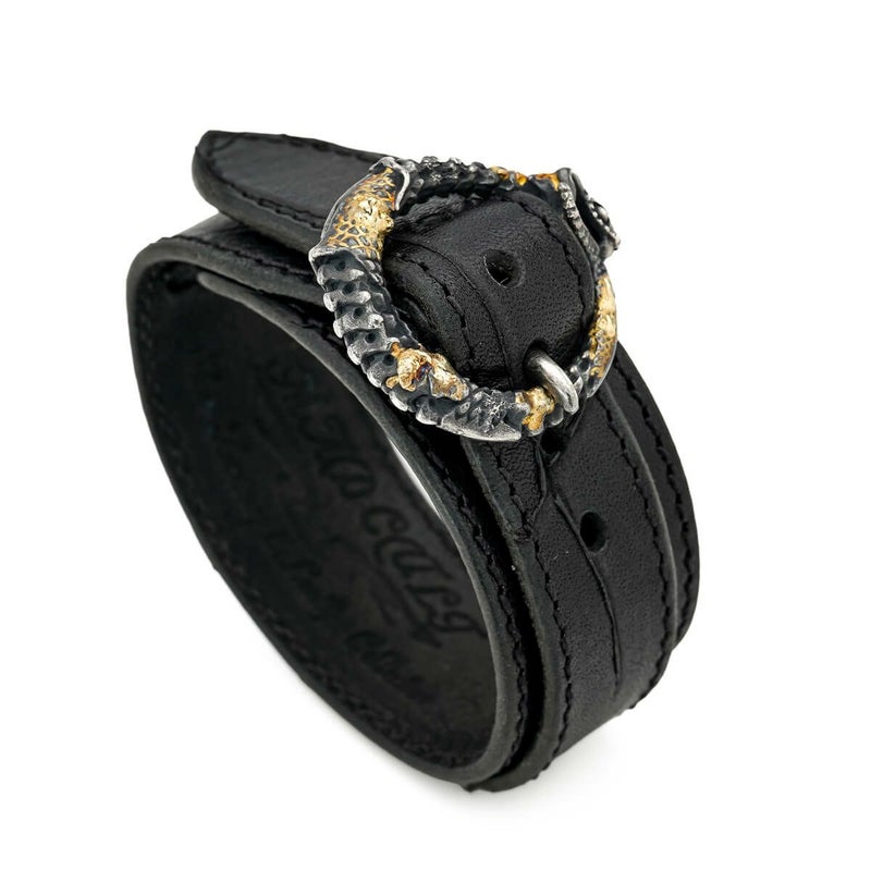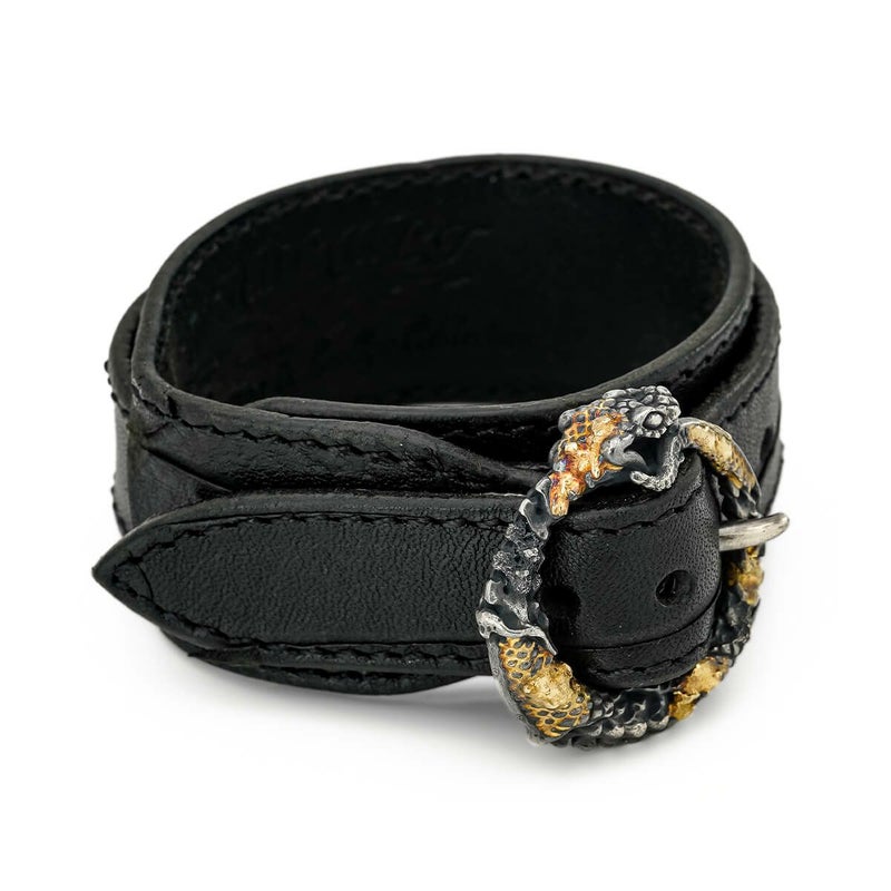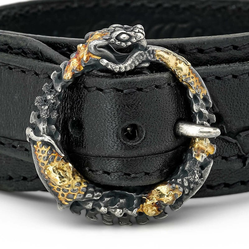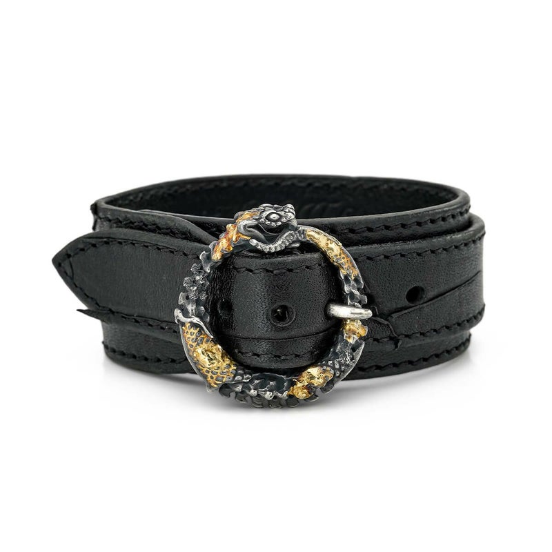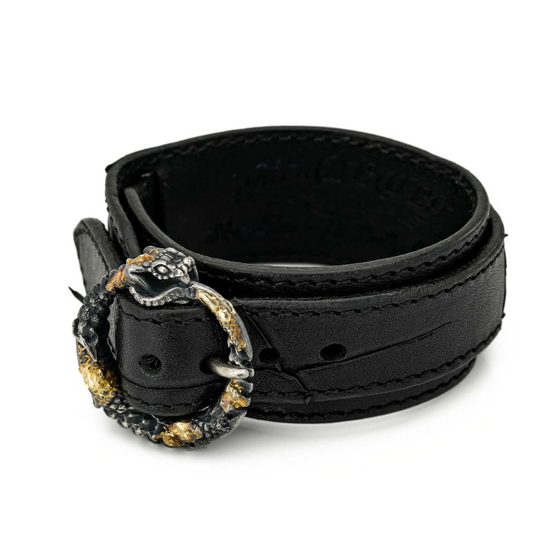 朽ちてもなお自身の尾を咥え続ける、死と再生を意味するウロボロスの姿をバックルに用いたレザーブレス。