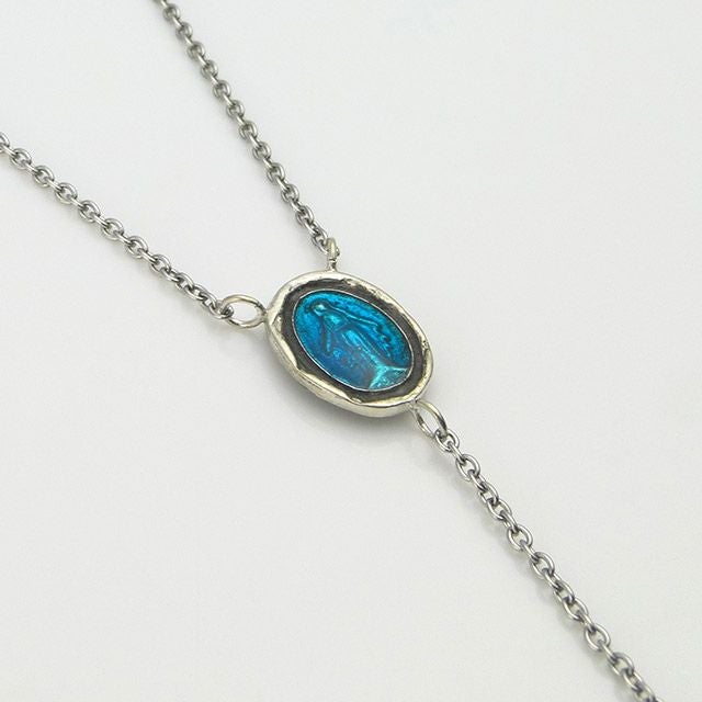 ブルーに染められたシルバーのマリアメダイとシルバーのクロスに磔られたブラスのキリストを組み上げたロザリオネックレスになります。