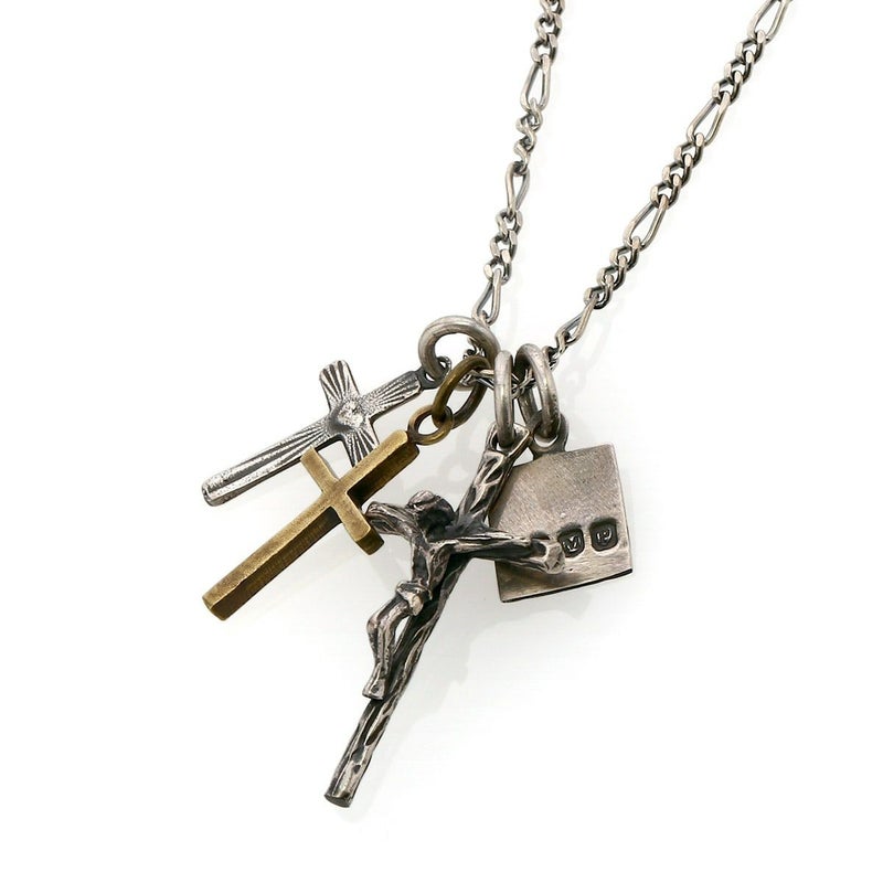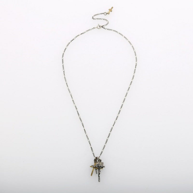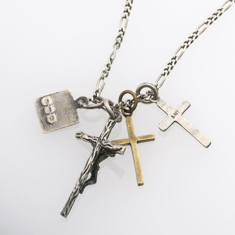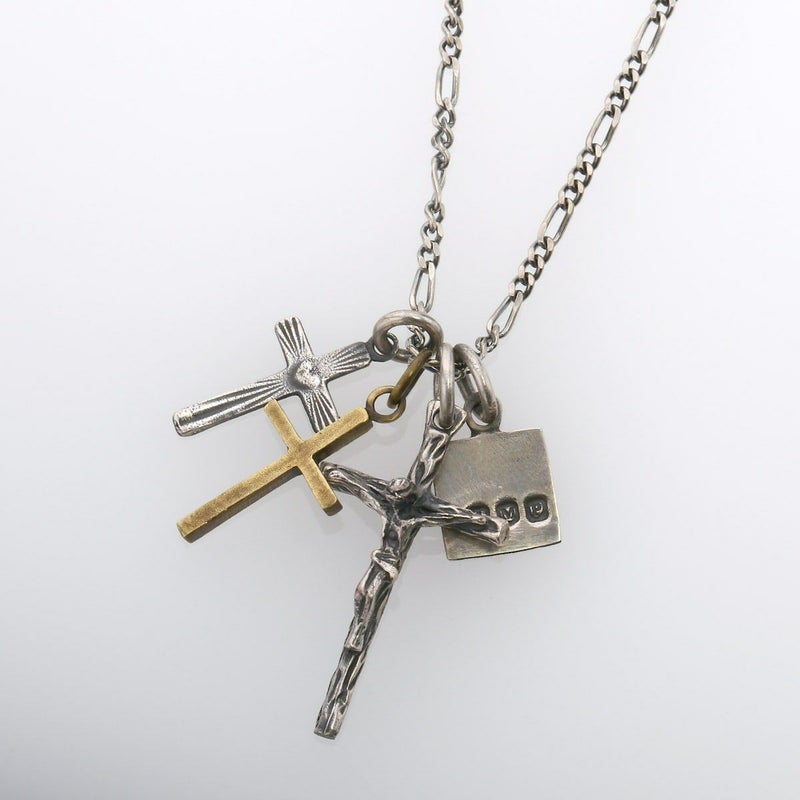 シルバー製のジーザスをメイントップに配しハートクロスと真鍮製クロスで構成したネックレスになります。引き輪の留め位置を変えれていただければ40cmと45cmでサイズ調節が可能です。
