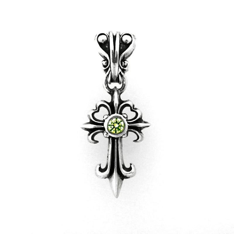 クロスラインの流れるような美しさを引き立たせた、中央にワンポイントの天然石を組み合わせたシンプルな十字架。ナチュラルな輝きのあるグリーンダイヤモンドとの組み合わせは、胸元に柔らかな雰囲気を与えてくれる。
