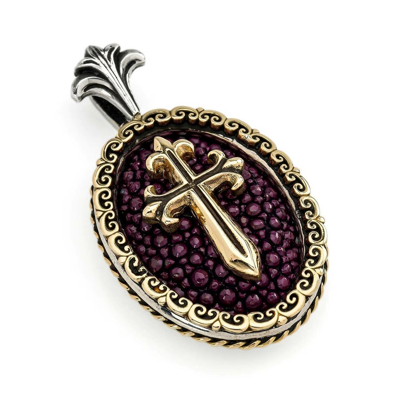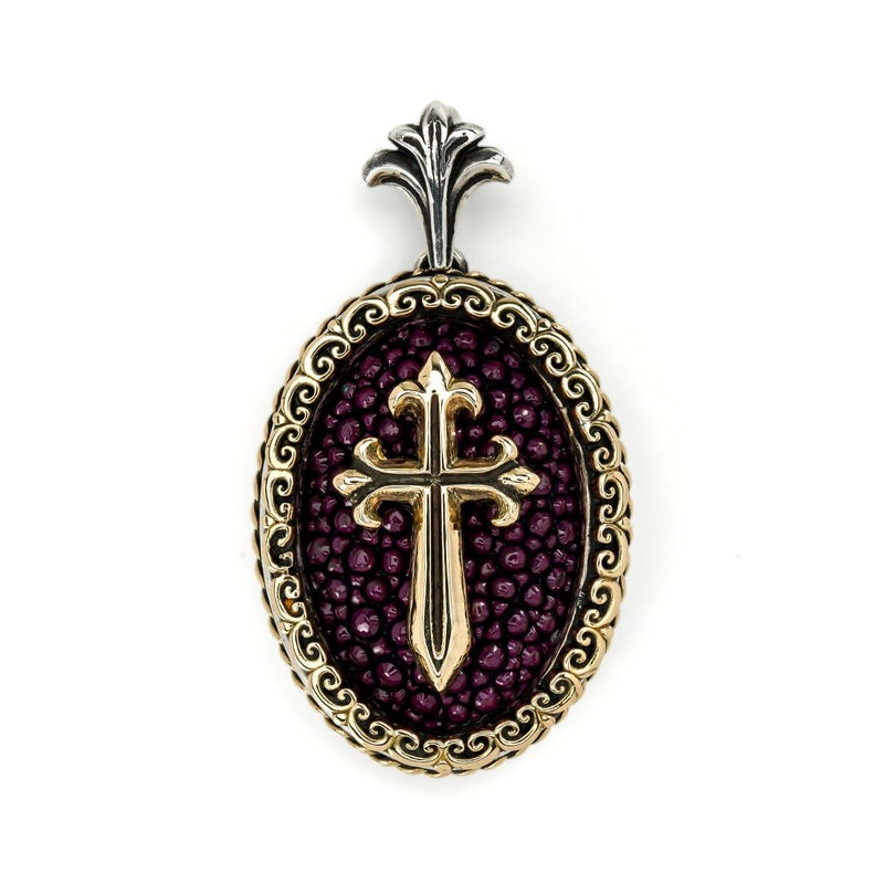 レザーズアンドトレジャーズ ラージオーバルインレイペンダントw/K18フィリグリーベゼル&ロープエッジ w/K18ポリチーノクロス w/スティングレイ(パープル)