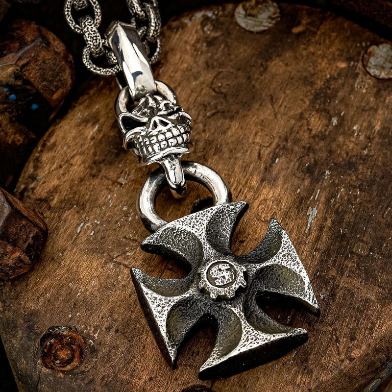 人気の高いプレーンモールティーズクロスペンダントにハンドメイドでテクスチャーを加え、更に新作のマイクロスカルステッチーズリンクを組み合わせたカスタムのペンダント。