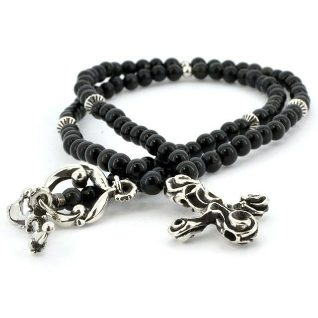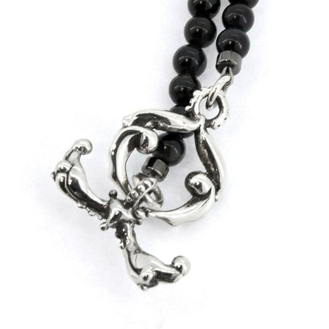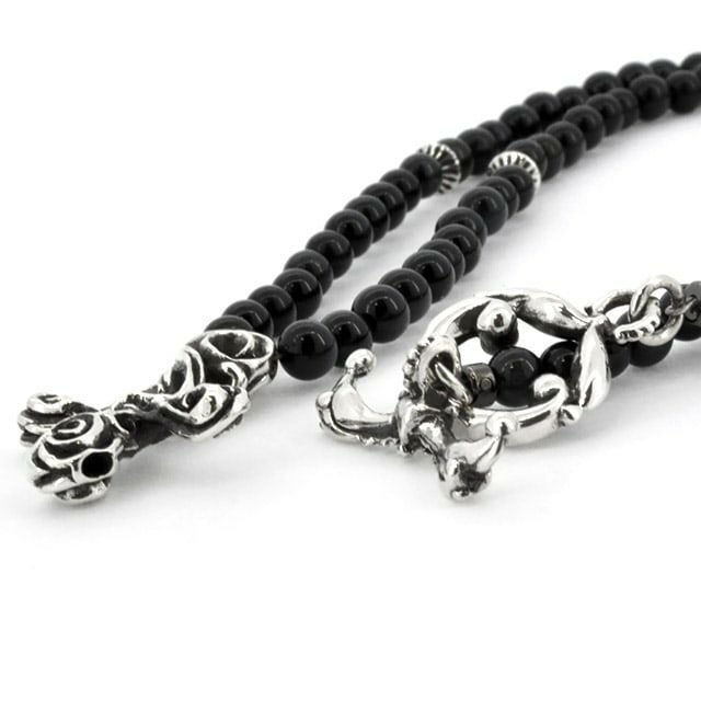 カルマをイメージしたクレインカルマネックレスのカスタムヴァージョン。ブラックタイガーアイの石をチェーンに使用しポイントにシルバーパーツを連ねたペンダントネックレス