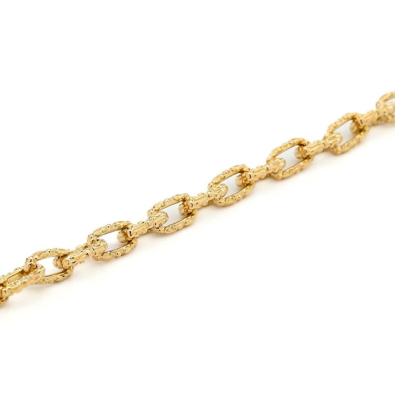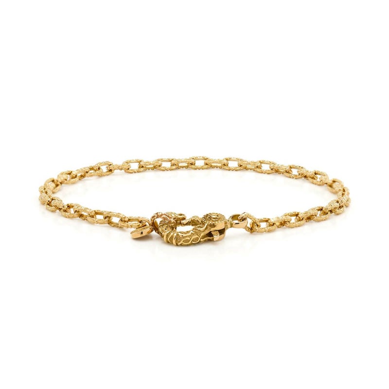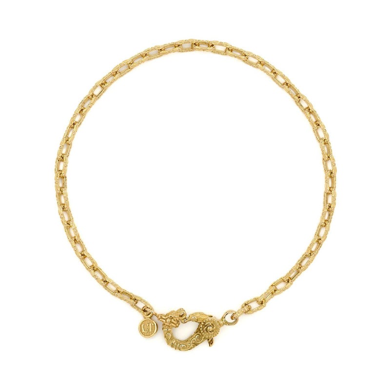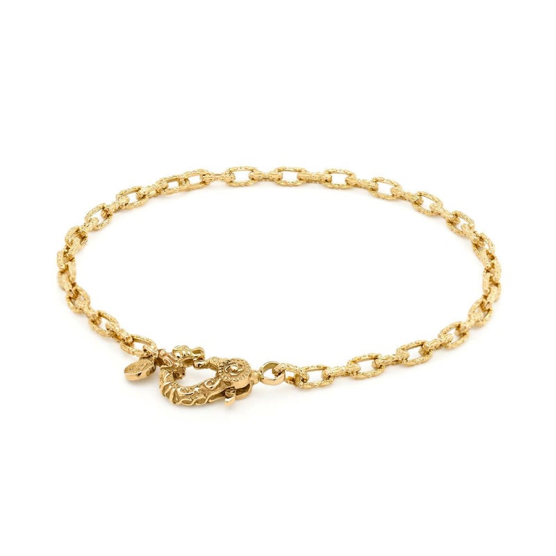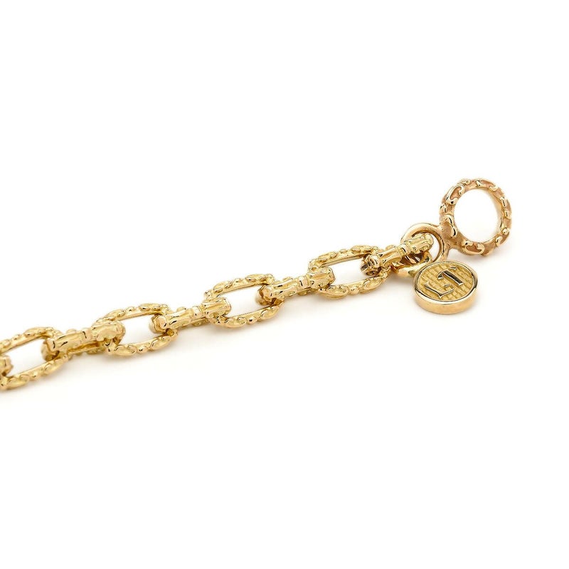 百合の紋章をイメージしたリンクパーツを繊細に繋ぎ、上品さと控えめな存在感を兼ね備えたブレスレット。K18イエローゴールドの輝きが手元に優雅さを添え、人気のケルティッククラスプが留め金部分でアクセントを加えています。さりげないコーディネートを楽しむことができ、幅広いスタイルにマッチする洗練された一品です。