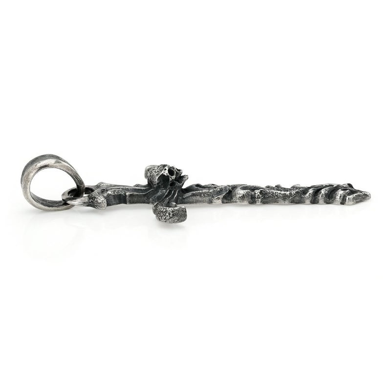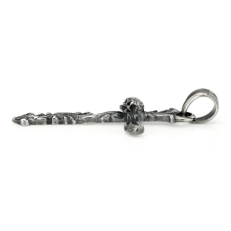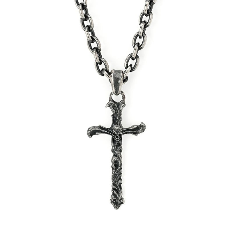 程よい大きさのクロスに繊細な彫りで表現した流麗なフロー柄と、ワンポイントのアクセントとして中央に小振りのスカルを組み合わせたペンダント。