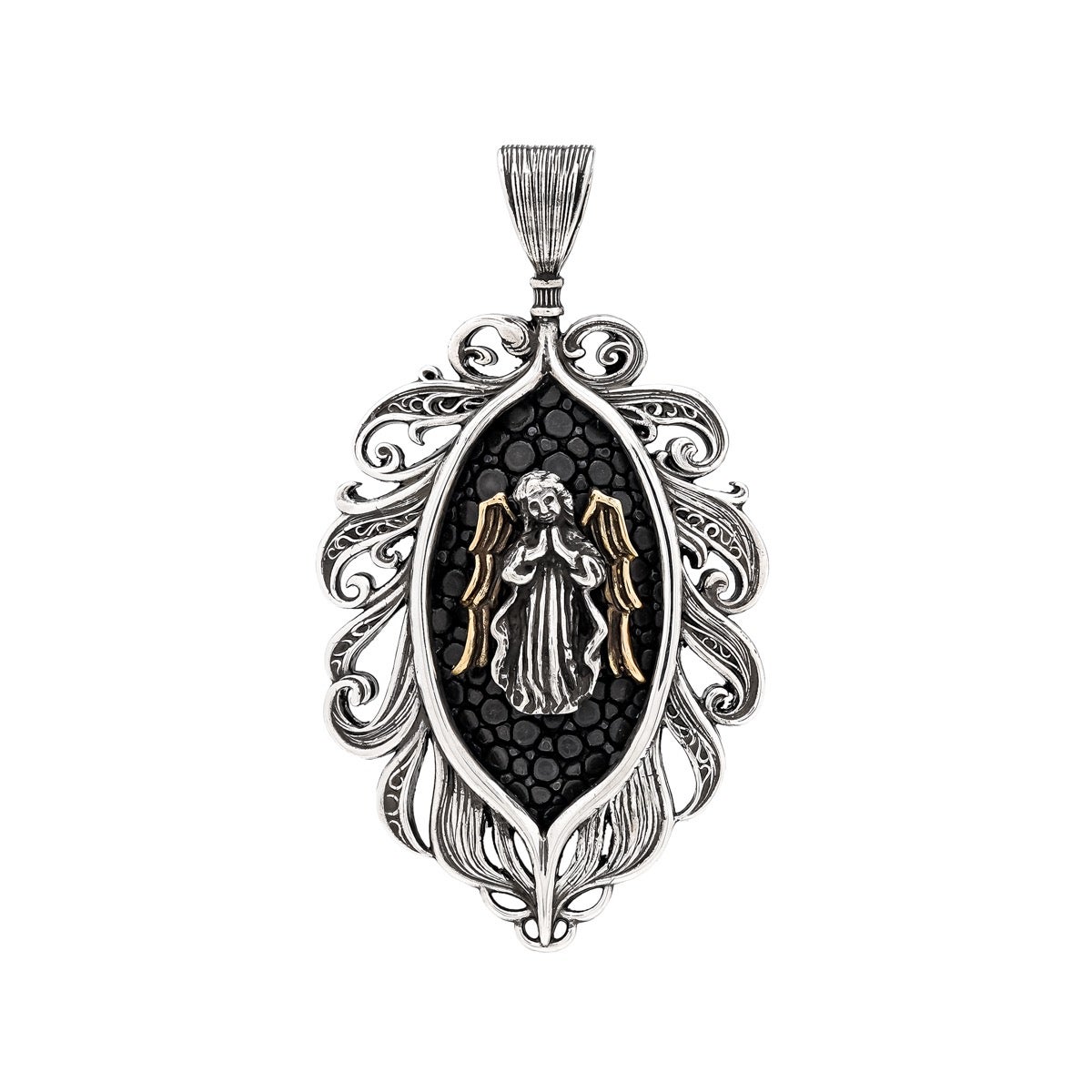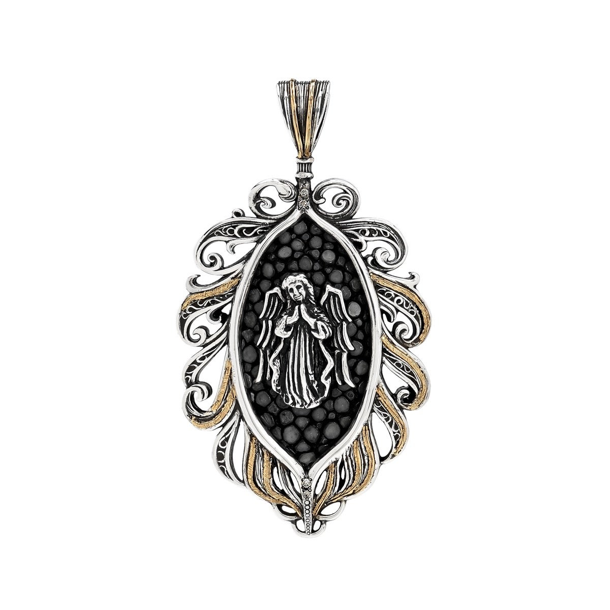 他の画像を見る カートに入れる レザーズアンドトレジャーズ エンブレイスフェザーインレイペンダント w/ガーディアンエンジェル w/K18YGウイング w/サンディッドスティングレイ(レザーカラー選択可能) ¥ 286,000 税込 販売開始前です。 販売期間 2026/04/25 12:00 〜